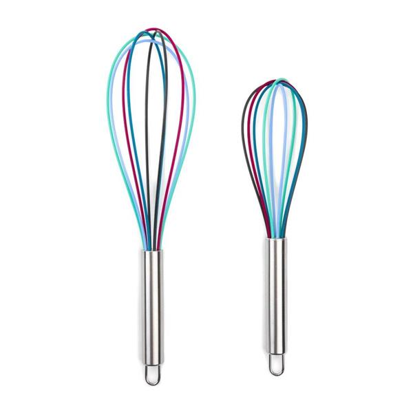 nonstick silicone. Core Kitchen's Modern Silicone Whisk Sets are designed with a bright colored silicone head and modern stainless steel handles. This cool rainbow-colored set includes two kitchen whisks for adding air to creams, sauces, and eggs.