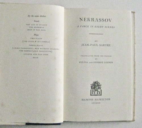 Jean-Paul Sartre Nekrassov A Play Published by Hamish Hamilton London 1956 First edition Book is in good condition. Pages are quite tight and clean with occasional light marks. Cloth boards are very good - no problems. Unclipped dust jacket is good - slight wear and edge wear with light stains and a few short pen ticks on the rear (photo). Spine is quite bright. Book is slightly cocked. Inscription to fep. 157 pages Book size 7.8”x 5.1” UK Postage £4.50 first class standard, Europe is £8.50 airmail, Rest of World is £14.50 airmail