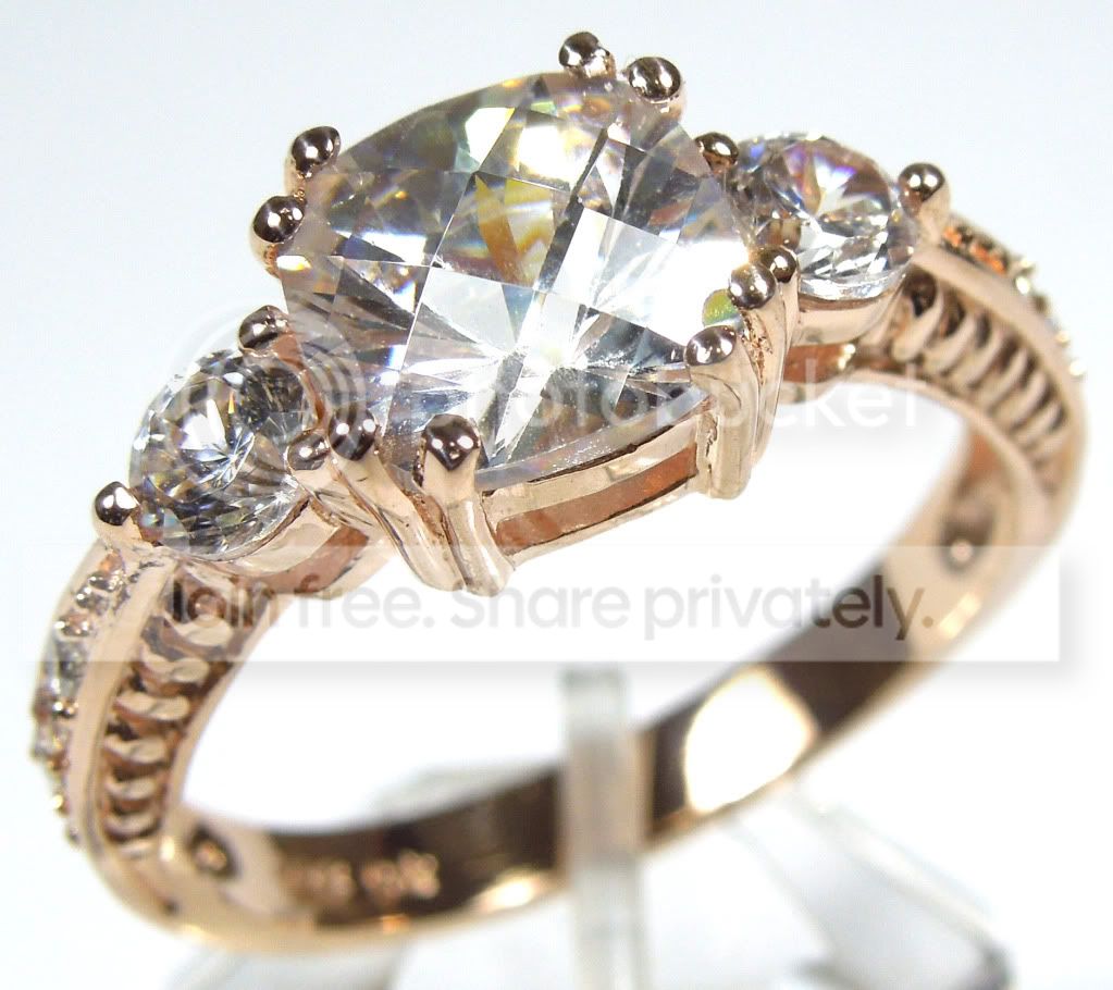 Elegant brand new high quality 14kt Rose Gold plated over sterling silver Ring with sparkling brilliant cut Cubic Zirconia stones set on solid 925 sterling silver and stamped with 925. Center stone is 8mm cushion shape and accent stones are 4mm rounds. Our silver is genuine 925 sterling silver. You will receive the item in a gift box. Thanks for looking and check out more items in my Ebay Store for more great items and deals!