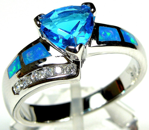 Brand new classy high quality Sterling silver ring with lab created blue inlay Fire Opals and 7 mm trillion cut London Blue topaz stone. Accented with Cubic Zirconia stones, is set on solid 925 sterling silver, and stamped with 925. Our silver is genuine 925 sterling silver and Rhodium plated for better quality and prolonged shine. You will receive the item in a gift box. Thanks for looking and buy with confidence. Please check out more items in my Ebay Store for more great items and deals!