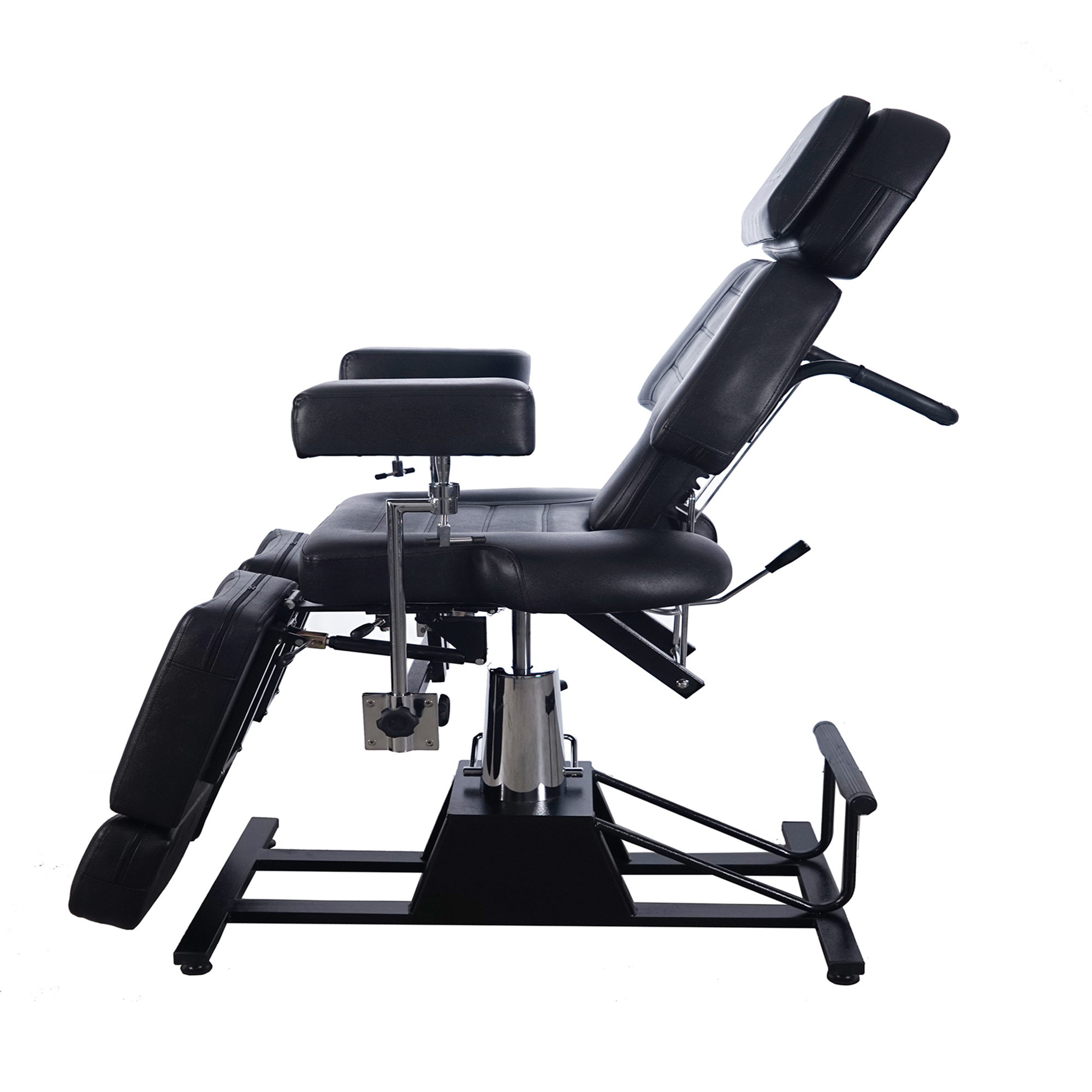 Die hydraulische Liege ist aus hochwertigem Stahlrahmen gefertigt. Die Stahlbasis ist schwer und stabil. Über eine hydraulische Pumpe ist die Höhe der Liege von 70 cm bis 81 cm verstellbar. Die beide Armlehnen sind mit einem Drehknopf unten drehbar und nach außen bis 14 cm manuell ausziehbar. Die Armlehnen sind abnehmbar, passen sich aber auch der Liegeposition an. Die Höhe der beiden Armlehnen wird manuell eingestellt. Die beide geteiltes Fußlehnen werden die Neigungswinkel bis zu 55 Grad von oben und unten oder bis zu 60 Grad von links nach rechts per Hebel verändert, wodurch man optimal die Pediküre durchführen kann. Das Kopfpolster und Fußpolster der Liege sind nach der Körpergröße des Kunden getrennt bis 14 cm und 11 cm ausziehbar. Die Neigungswinkel der Rücklehne und des Fußteils sind per Hebel manuell 10 Stufen bis 180 Grad verstellbar. Die Liege ist um 360° drehbar. Es kommt auch mit abnehmbarem Kopfpolster und einem verchromten Handtuchhalter, sodass auch Massagen auf dieser Liege durchgeführt werden können. 100% premiumes Polyurethan (PU) Kunstleder ist sehr leicht zu reinigen. Die dick gepolsterte Liegefläche bietet Unterstützung für Ihren Körper und noch mehr Komfort.