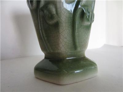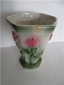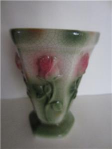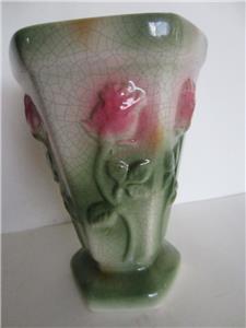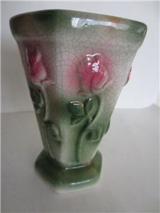| Vintage 1940's Crackle Vase Bloom Rite Shabby Pink Roses Green Crazing Chic |