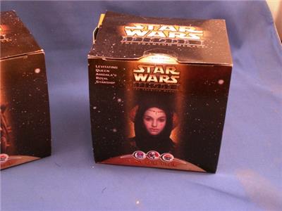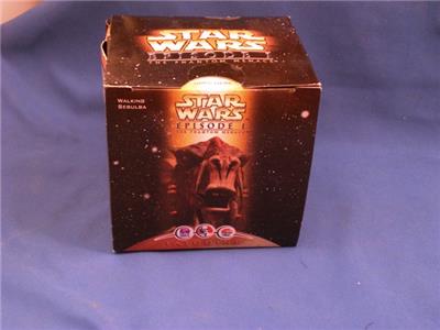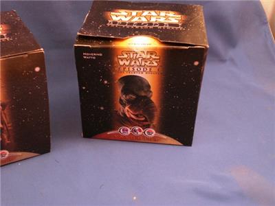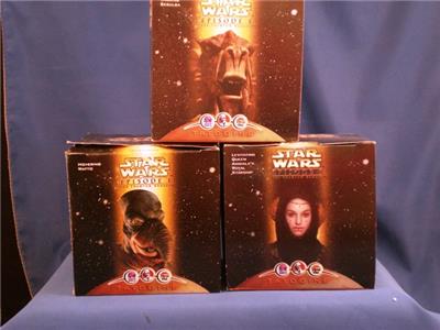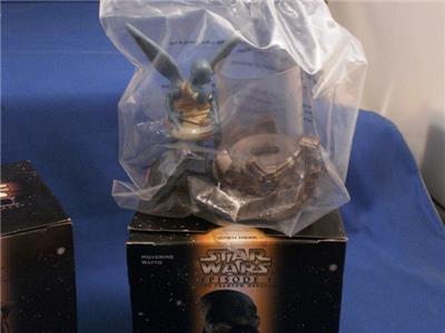 This is a (3) piece set of Tatooine Star Wars Episode1 items from Taco Bell. The first is the Hovering Watto. The second is the Walking Sebulba , and the third is the Levitating Queen Amidala Royal Starship. All toys are still in packaging and have the original boxes.