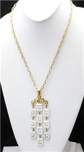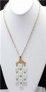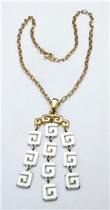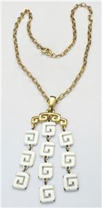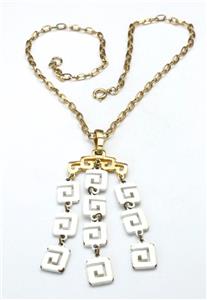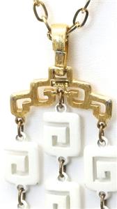 Vintage Statement Trifari Dangling White Greek Key Necklace Chain 20" Gold Tone