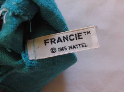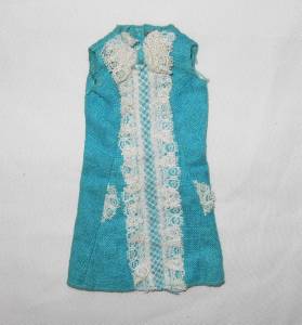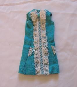 Vintage Barbie Francie # 1274 Iced Blue dress only from 1967. Turquoise and lace a-line dress. Fabric is crisp with no rips, tears, pulls, frays, stains, spots, etc. Francie tm tag is crisp.