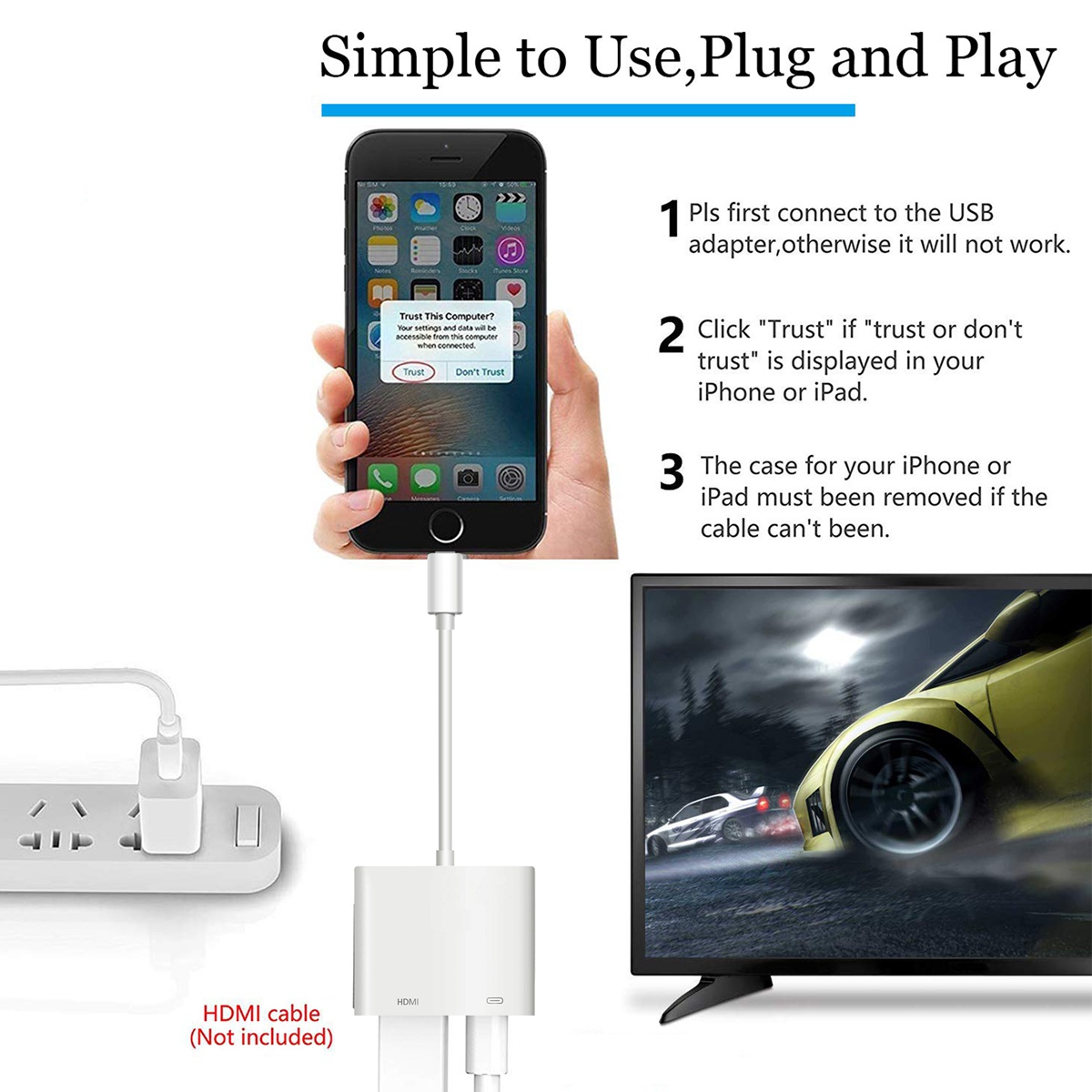 - Plug and Play Technology: Easy installation within 2 minutes, Please ONLY use the Apple original lightning charging cable or the Apple MFI Certified lightning cable to power adapter to charge, then click the "Trust" button when connecting and then wait it to connect automatically. Note: Please make sure the lightning female port connect to the charging power supply, otherwise the item will not work! (Please only use the Apple original charging cord or Apple MFI Certified Charging Cord with Apple Original Wall adapter 5V/2A).