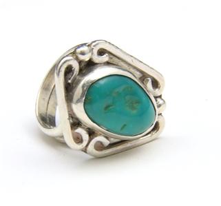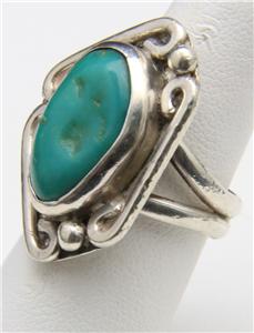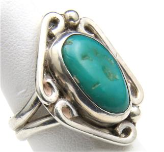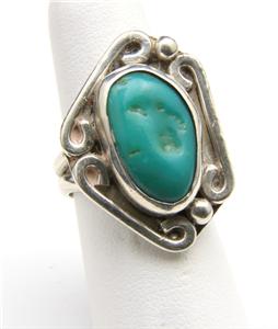 Wonderful vintage sterling silver and green turquoise ring. Silverwork is well done with platform, bracket swirls and bubble / drop detail. In the center of ring face is a beautiful piece of natural green turquoise that measures .73" tall by .5" wide. Ring face measures 1.14" tall by .81" wide and .31" deep. Ring is size 7.25 and weighs 9.8 grams. Ring is in very good vintage condition overall. Stone is slightly loose in bezel but secure. Sterling silver has some fine scratches and a couple shallow dings on band. A great, well-crafted southwestern artisan ring.