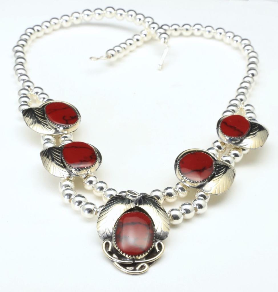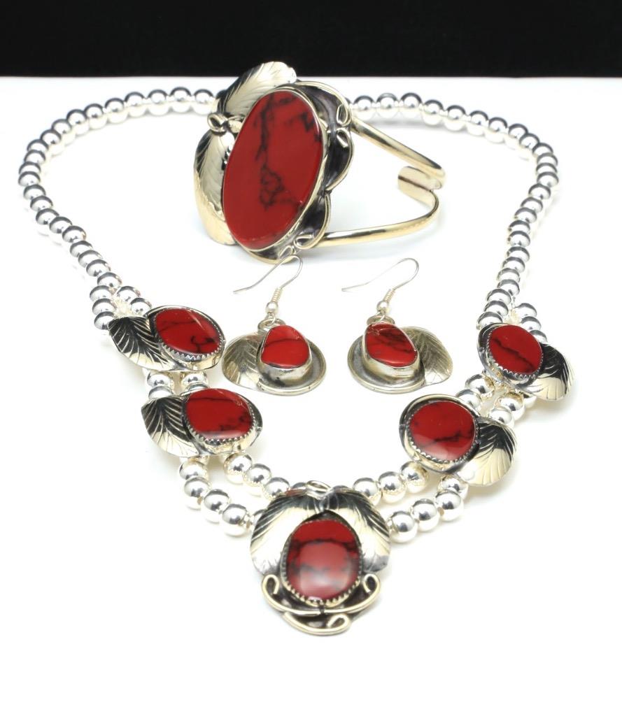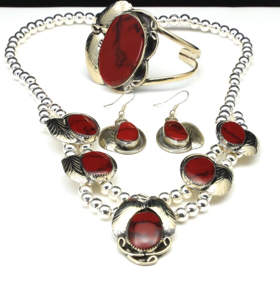 -Add some wow factor to your ensemble with this sterling silver and red turquoise necklace/bracelet/earrings set