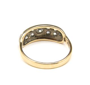 - Ring has 11 diamonds, 1 larger center diamond flanked by four smaller diamonds on each side and one inset diamond on each end