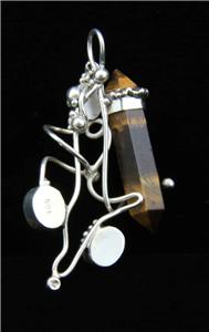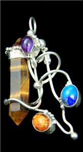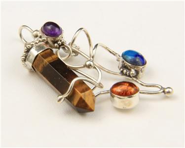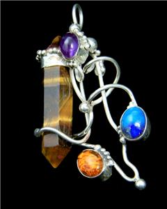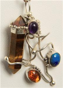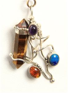 Fantastic whimsical sterling silver necklace pendant featuring multiple gemstones. Pendant has a large tiger's eye crystal wrapped in sterling silver as well as amethyst, amber and chrysocolla rounds set in solid sterling bezels surrounded by sterling free form wires and bubble/drop detail. A truly stunning gemstone pendant. Pendant is marked "925" Measurements: Pendant measures 2.02" tall by 1.20" wide and .47" deep Tiger's eye "crystal" measures 1.27" tall by .28" wide and deep Amber measures 8mm tall by 6mm wide Chrysocolla measures 8mm tall by 6mm wide Amethyst measures 7mm tall by 5mm wide Pendant weighs 9.2 grams BEFORE BIDDING