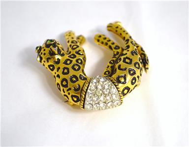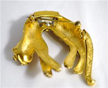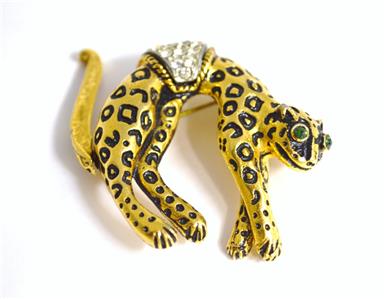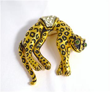 Accents: This fun Leopard or Cheetah pin is plated in gold, with black enameling. The eyes are green rhinestones and wears a white rhinestone saddle. The articulated tail "wags" when the wearer moves. Safety clasp holds well