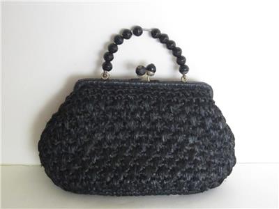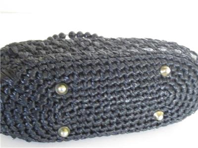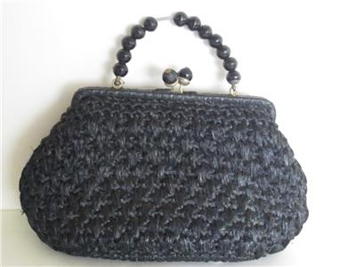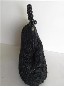 | Vintage Black Straw Handbag ITALY Beaded Handle Large Kisslock Closure Raffia |