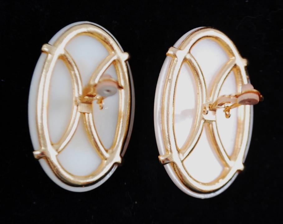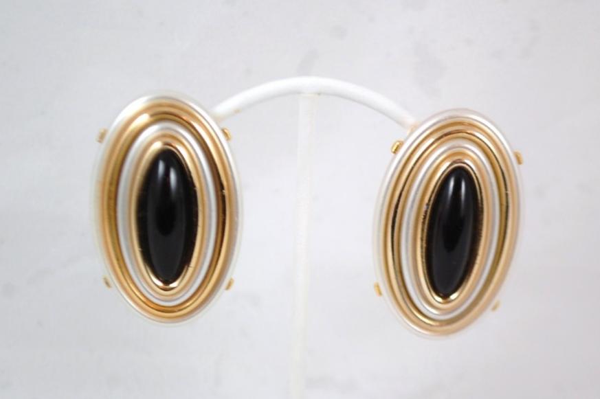 STUNNING LARGE OVAL GOLD AND SILVER-TONE WITH OVAL ONYX STONE COMFORT CLIP-ON EARRINGS