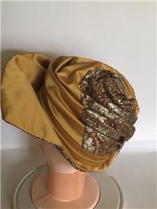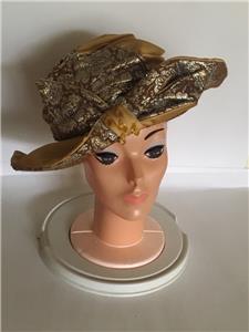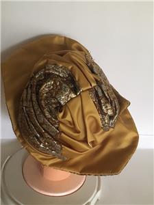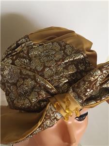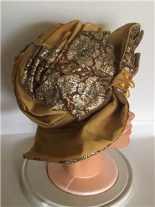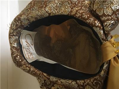 Vintage very unique hat, a Charo Original. Gold metallic brocade fabric with contrasting gold satin fabric with a big bow in the front and dangling yellow beading.