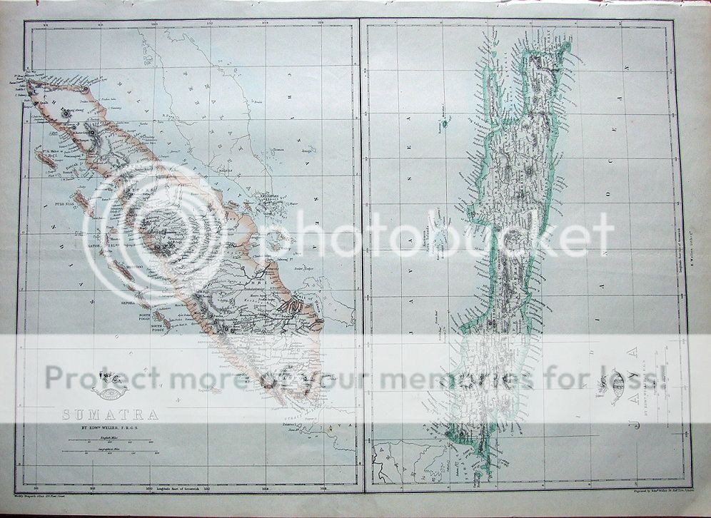 | SUMATRA & JAVA Two antique lithographed maps of Sumatra & Java from "The Weekly Dispatch Atlas" published London c1860. Drawn & engraved by Edward Weller, London . Please scroll to the very end to view further close up images With outline hand colouring and in fine, unmarked condition with centrefold as issued. Measuring approx. 17" x 12" (430mm x 310mm) map area only, with margins beyond, on light grade paper, blank verso. A crisp impression Eminently suitable for framing. A GENUINE ANTIQUE MAP GUARANTEED OVER 150 YEARS OLD FROM LINDISFARNE PRINTS We do not deal in reproductions, facsimiles or copies of any kind. SHIPPING: Within UK £2.95 Royal Mail 1st class post From UK to Europe £3.95 Royal Mail Air Mail From UK to USA & Rest of the World £ 4.95 Royal Mail Air Mail TWO ITEMS WILL BE COMBINED WITH ONE SHIPPING CHARGE. THREE ITEMS OR MORE WILL BE SHIPPED FREE OF CHARGE WORLDWIDE Why not browse our ebaystore? .............................................................. THANKS FOR YOUR INTEREST! ............................................................ Be sure to add me to your favorites list! Check out my other items!  D912 |