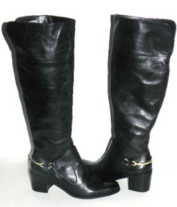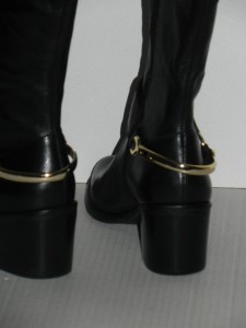 - Over-the-knee riding boots with gold-tone horseshoe detail on back of heel.