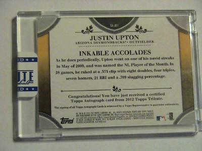Description This is a 2012 Topps Tribute Inkable Accolades Justin Upton black print plate authentic uncirculated autograph. Serial numbered 1/1. First Class Shipping will be FREE. PLEASE SEE MY OTHER AUCTIONS AND VISIT MY EBAY STORE