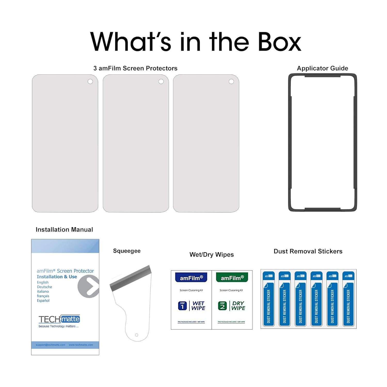 Includes: (3) Tempered Glass Screen Protectors, (1) Installation Tray, (2) Wet/Dry Wipes, (1) Squeeze Card, (6) Dust Removal Stickers, (1) Installation/User Guide