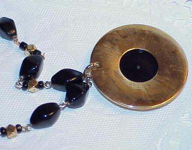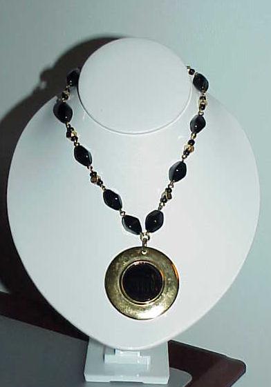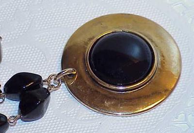Black Glass Gripoix Heavy Gold Mod Disc Necklace Black Bead Chain Vintage |