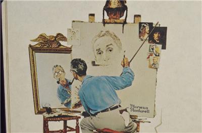 NOTE: TRIBUTE FEATURING HIS FAMOUS "TRIPLE SELF-PORTRAIT" BEARS ALL THREE FAMOUS ROCKWELL STAMPS IS POSTMARKED IN STOCKBRIDGE, MASSACHUSETTS -- HIS HOME FOR 25 YEARS AND INSPIRATION FOR MANY OF HIS PAINTINGS