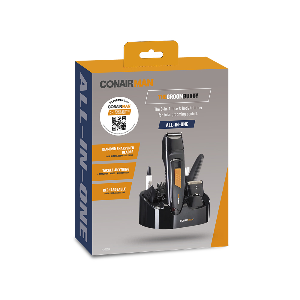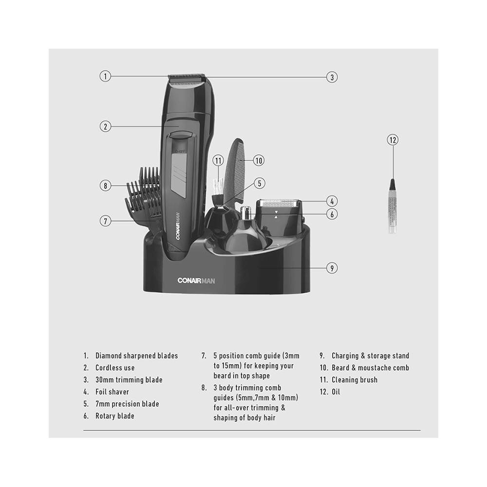 This is the perfect all-in-one grooming kit for the man that wants to tackle all body zones. It features a 30mm blades head for beard, stubble & body grooming, a rotary head for nose & ears, a foil shaver head for a close cut finish & a 7mm detail head for those finishing touches. With the ease of cordless use & a stand to store the trimmer & all the attachments, it's time to step