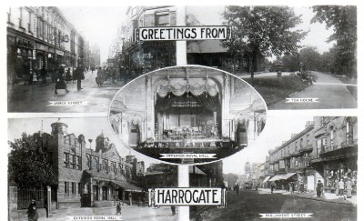 | Harrogate Multi View Royal Hall unused sepia RP old postcard Lilywhite |
