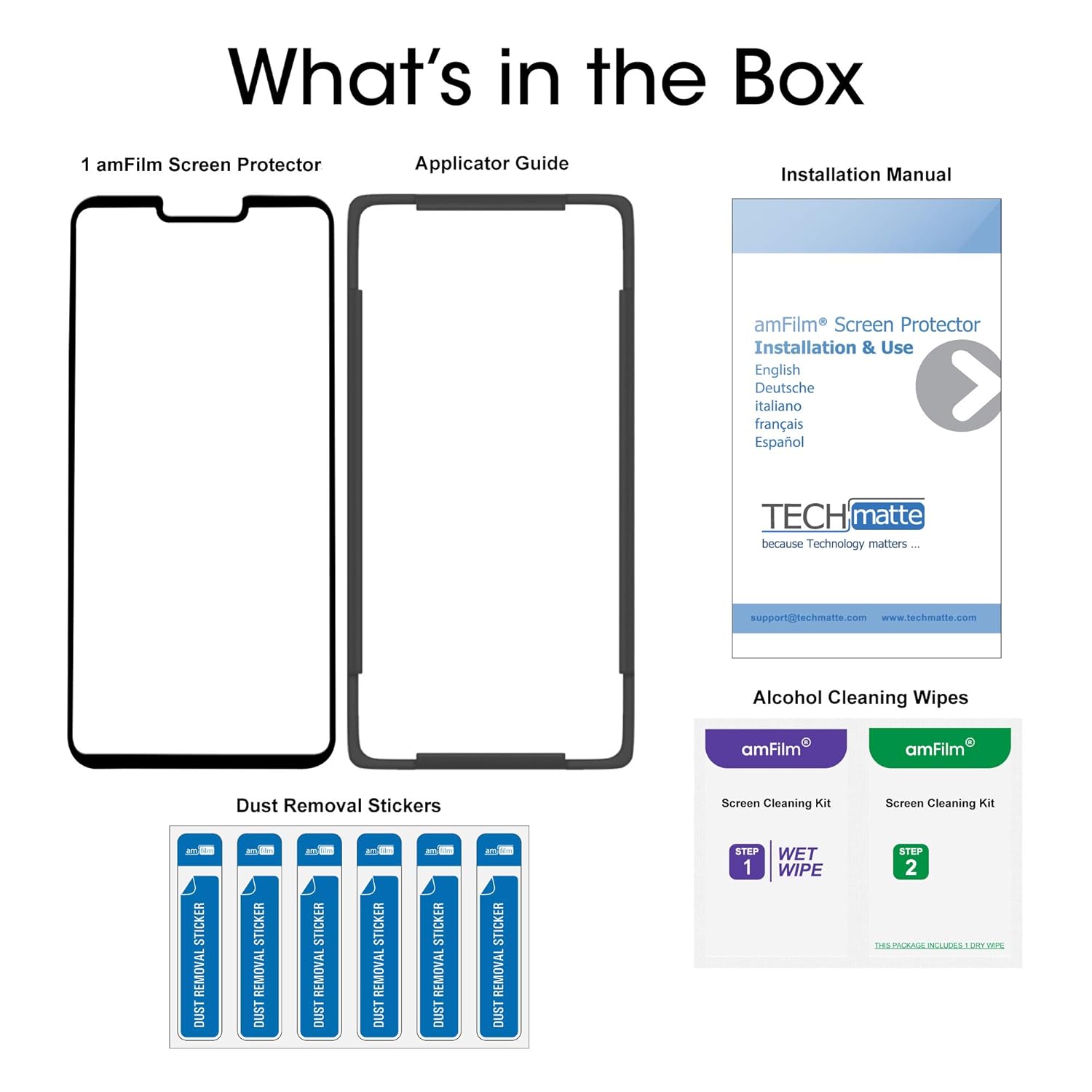 Includes: (1) Tempered Glass Screen Protector, (1) Installation Tray, (1) Wet/Dry Wipe, (6) Dust Removal Stickers, (1) Installation/User Guide