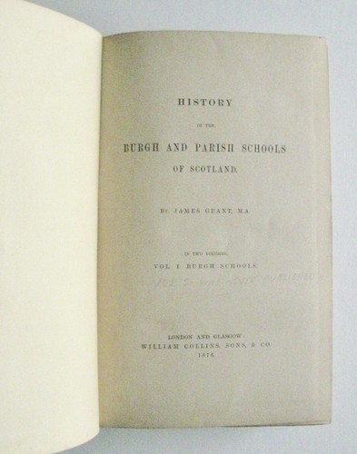 James Grant History of Burgh & Parish Schools vol I Published by William Collins & Sons London & Glasgow 1876 First Edition. This is vol I of a proposed 2 volume set but vol II was never published. This volume concerns the burgh schools mainly. Book is in good condition - pages are quite tight and clean with occasional, light marks. Quite a lot of very light pencil marks and a few notes the same. Paper seems to have toned a little. Cloth boards are good - light wear and edge wear. Spine rubbed slightly. Book now protected with plastic cover. Small name on fep. Quite heavy book & quite rare xvi + 571 pages Book size 10.1”x 6.2” UK Postage £6.50 first class standard, Europe is £11.50 airmail, Rest of World is £22.50 airmail