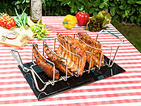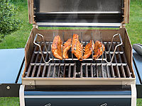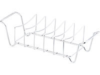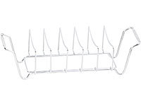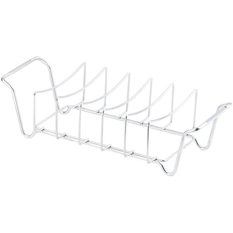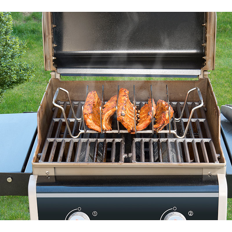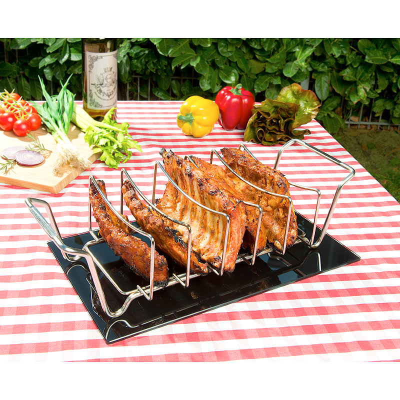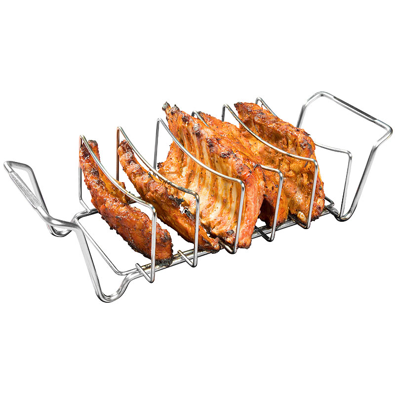 Bereiten Sie bis zu 5 Spareribs gleichzeitig zu: Diese platzieren Sie hochkant im Rippchenhalter. Auf diese Art verbrauchen sie viel weniger Platz auf dem Grill. Alternativ grillen Sie auch ganze Braten auf dem Gestell.