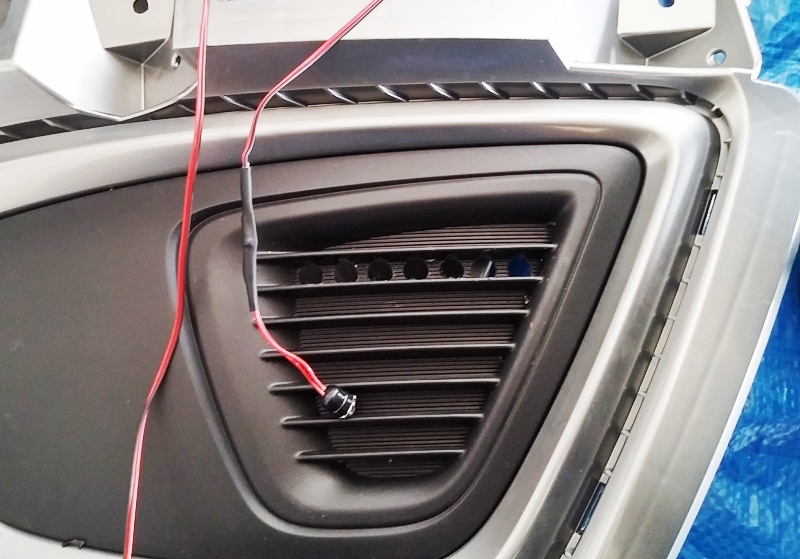 I installed six Prewired Superflux Chip LEDs in the rear, a High Intensity Flush Mount LED Bolt (3w, 11mm, stainless steel, cool white, no lens) in each headlight, a blue round rocker switch and a 12v battery holder to power the unit. I also used a 3/4" bit, strippers, pliers and crush connectors. I had to drill a hole in the "dash" for the switch, a couple holes to mount lights, a couple holes throughout the body and zip ties to hold some stuff in place.