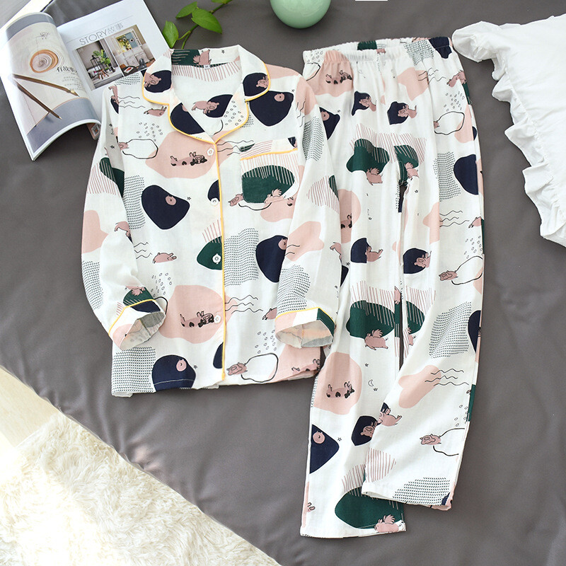 Korea Print Leaf Pajama Set Women 100% Gauze Cotton Long Sleeve Casual Sleepwear