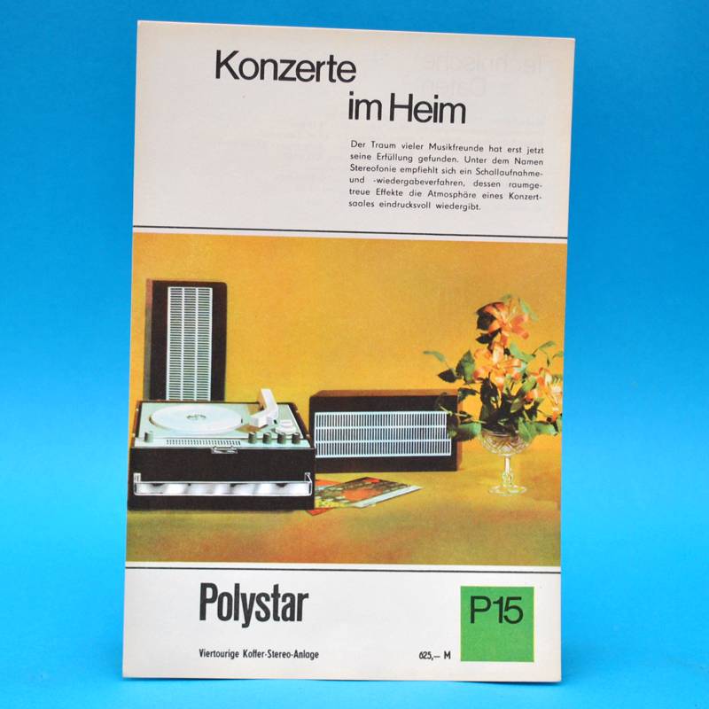Polystar Koffer-Stereo-Anlage Werbeblatt/Prospekt. Rückseite mit Beschreibung und Technischen Daten (selten mit weiteren Fotos). DEWAG 1968 * etwa 21 x 14 cm (kann leicht variieren) Sammlerexemplar. Werbeblätter sind in einer sehr guten bis nahezu druckfrischen Erhaltung (s. Foto unten, Abb. ähnlich). | |||