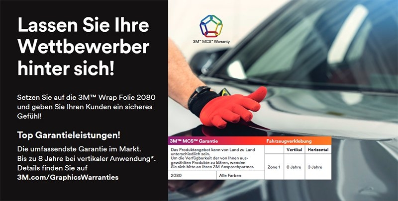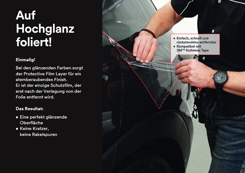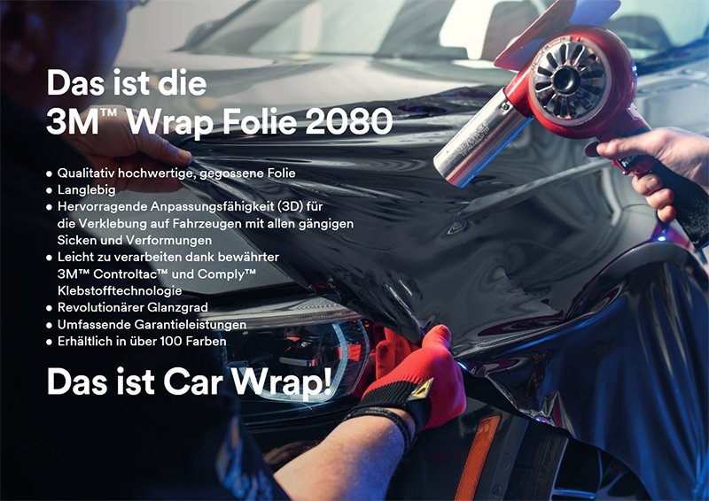 Die Folie der Serie 3M 2080 ist ein neues Produkt für die Fahrzeugvollverklebung, das einfacher anzubringen ist und sich noch besser an den Untergrund anpasst. Darüber hinaus verfügt die neue Serie über eine Schutzschicht, die alle glänzenden Farben schützt. Die Schutzschicht kann nach der Anbringung entfernt werden, so dass das Risiko von Abdrücken auf der Folie verringert wird.