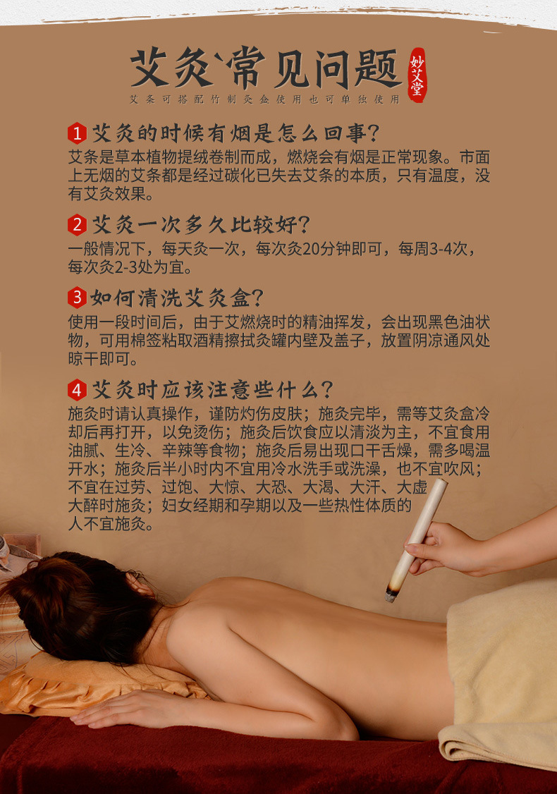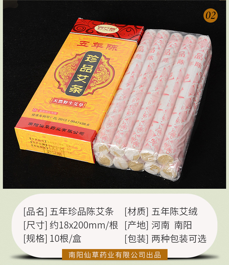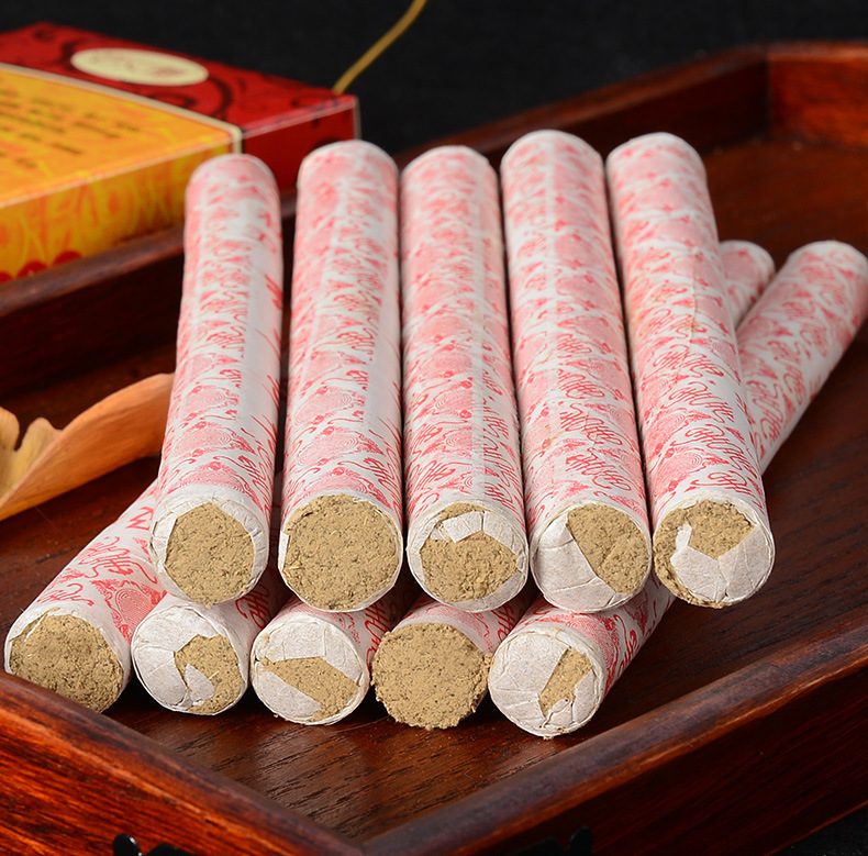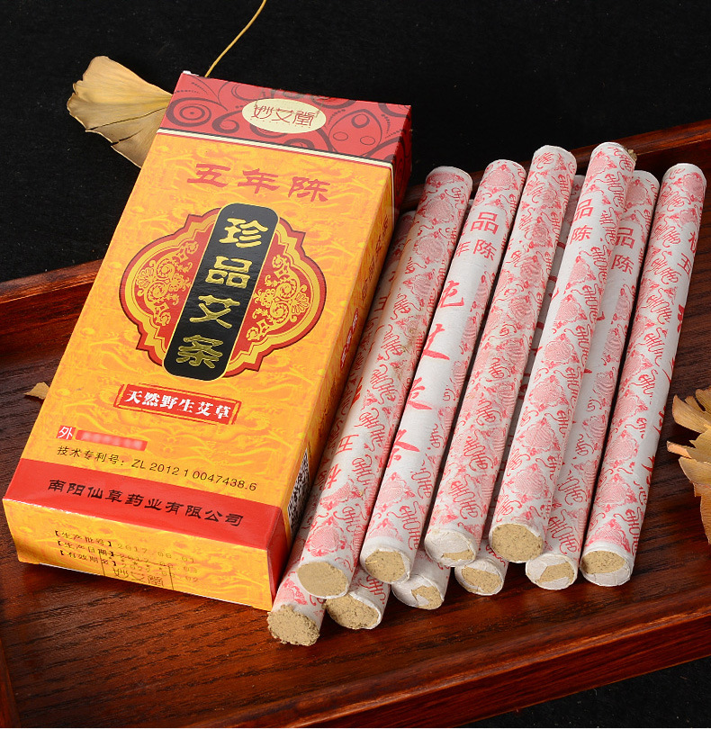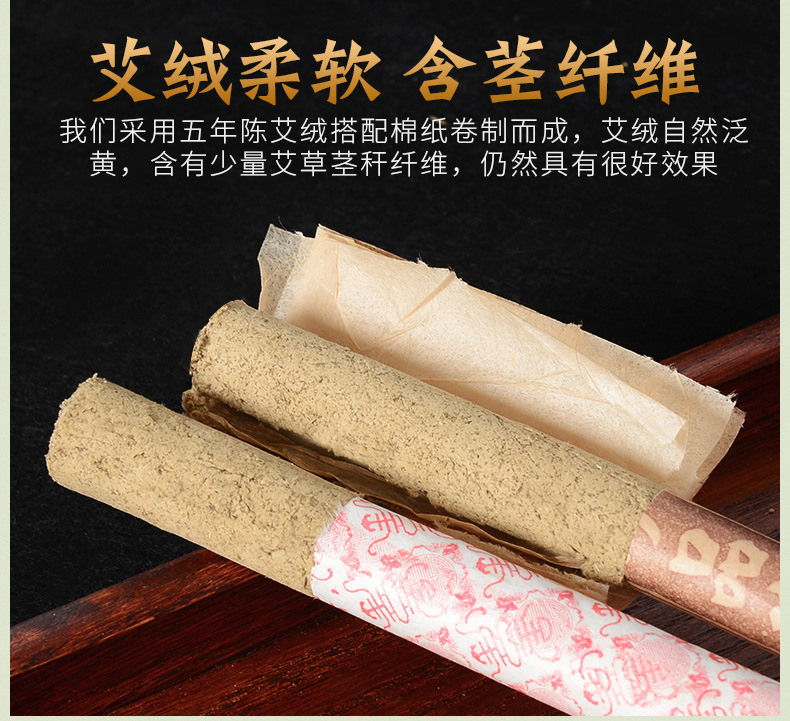 Ingredients: moxa velvet concentration ratio of 15: 1, made by hand-rolling. Uses: through the meridians, blood circulation, dampness by cold, loose silt swelling, disease prevention and health effect。Treat symptoms: cervical spondylosis, lumbar, shoulder, joint disorders, insomnia, headache, dysmenorrhea, abdominal pain, irregular menstruation, constipation, colds, etc