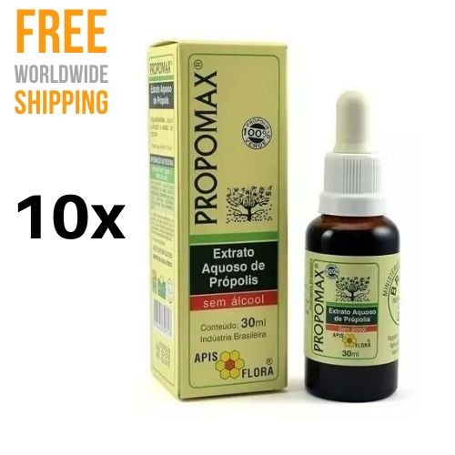 PROPOMAX Propolis Extract Brazilian NO Alcohol APIS FLORA 10x 30ml 5-Day Fedex Delivery Worldwide!!!PROPOMAX® is made with propolis extract 100% green, obtained by the exclusive Apis Flora technology, which keeps the high concentration of bioactives in an alcohol-free product. The processing of this extract results in a cutting-edge multi-platform technology, scientifically developed by Apis Flora in partnership with national research centers, in an attempt to purify the propolis extract, removing the inert substances from the product, making it completely soluble in water and, thus, crystalline when diluted in water. Propolis is a substance produced by the bees from resins of some kinds of plants or secretions found on some kind of trees or vegetal fissures. Bees add to his resin wax, pollen and to this paste they add salivary secretions and workout the propolis. The association of these noble products from the hive in the form of Extracts in Glycolic Solution (without alcohol) is better absorbed by the organism, bringing an overall increase in vitality. Propolis is known since ancient times as the elixir for good cures, it’s a food complement with comprehensive action in bacteria, fungus, and virus causéd pathologies, degenerative diseases, and a stimulant for scarring processes. It also increases the organism’s resistance. Contains: 1 Lot of 10 Bottles 30 mL (1 oz) PROPOMAX Apis Flora.