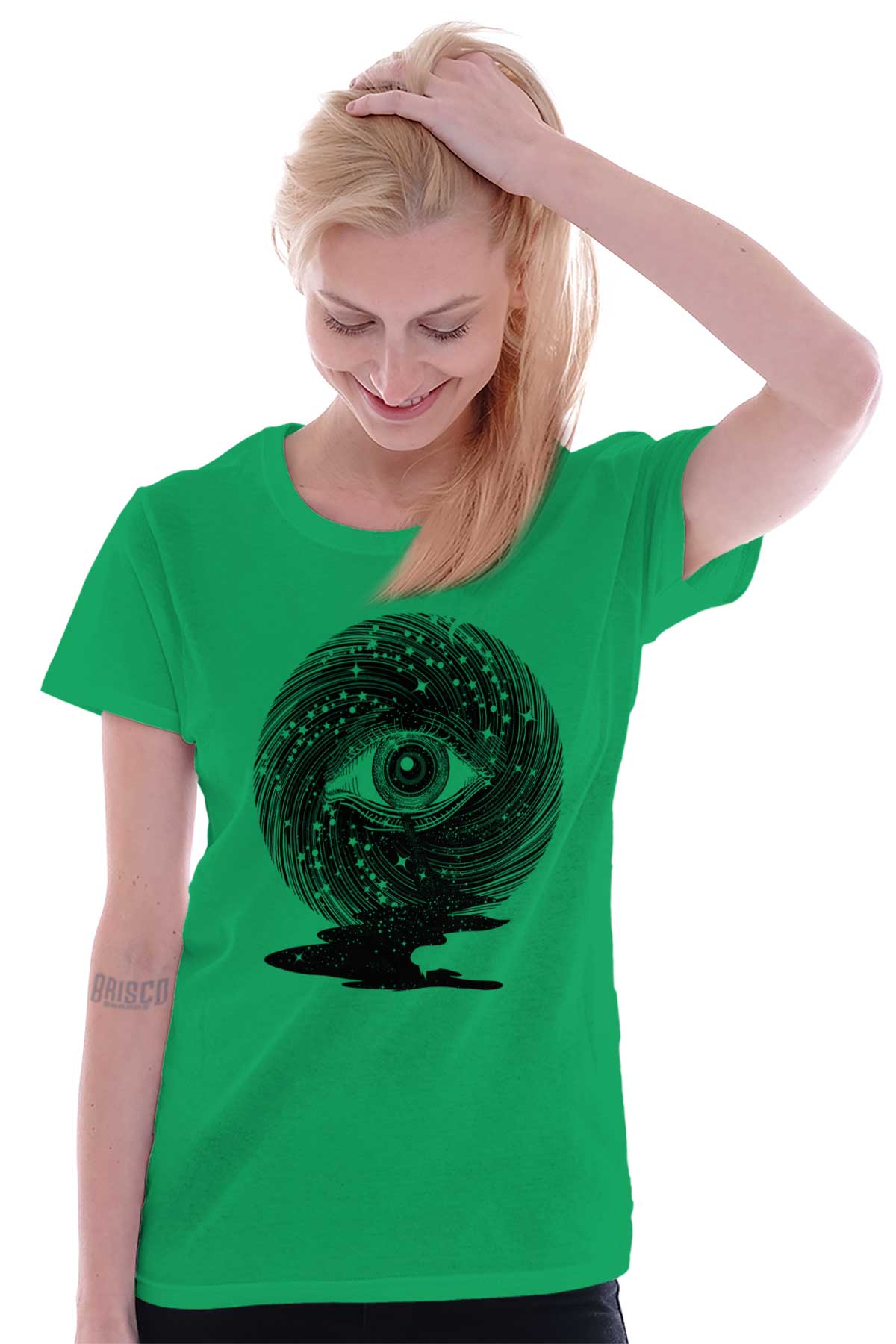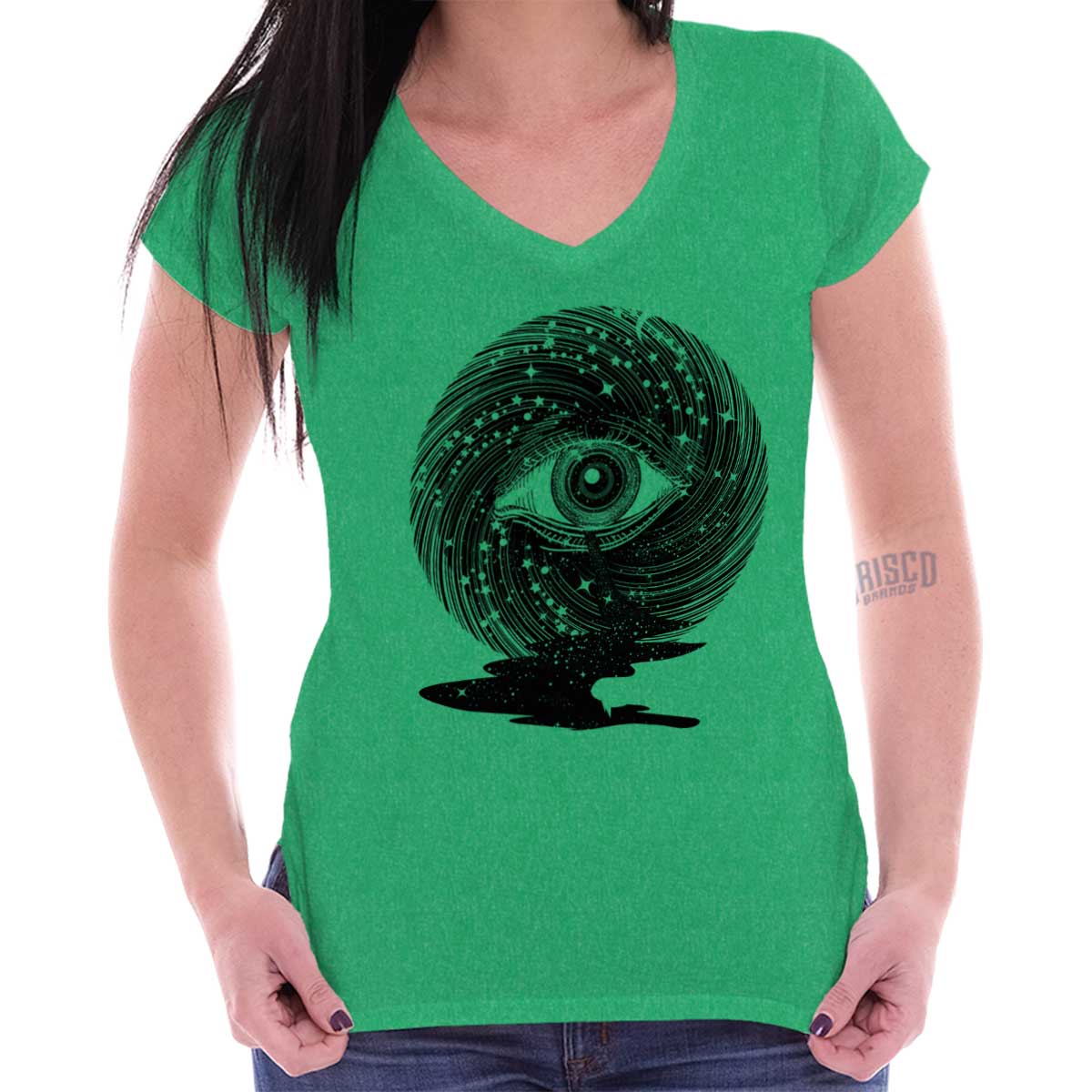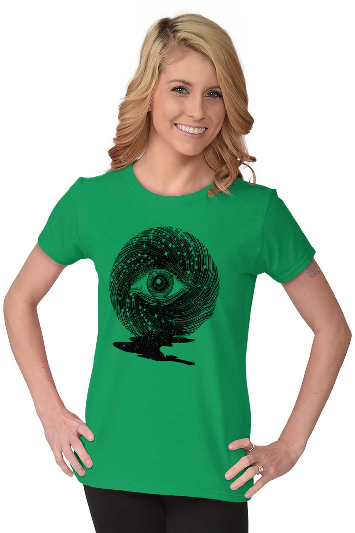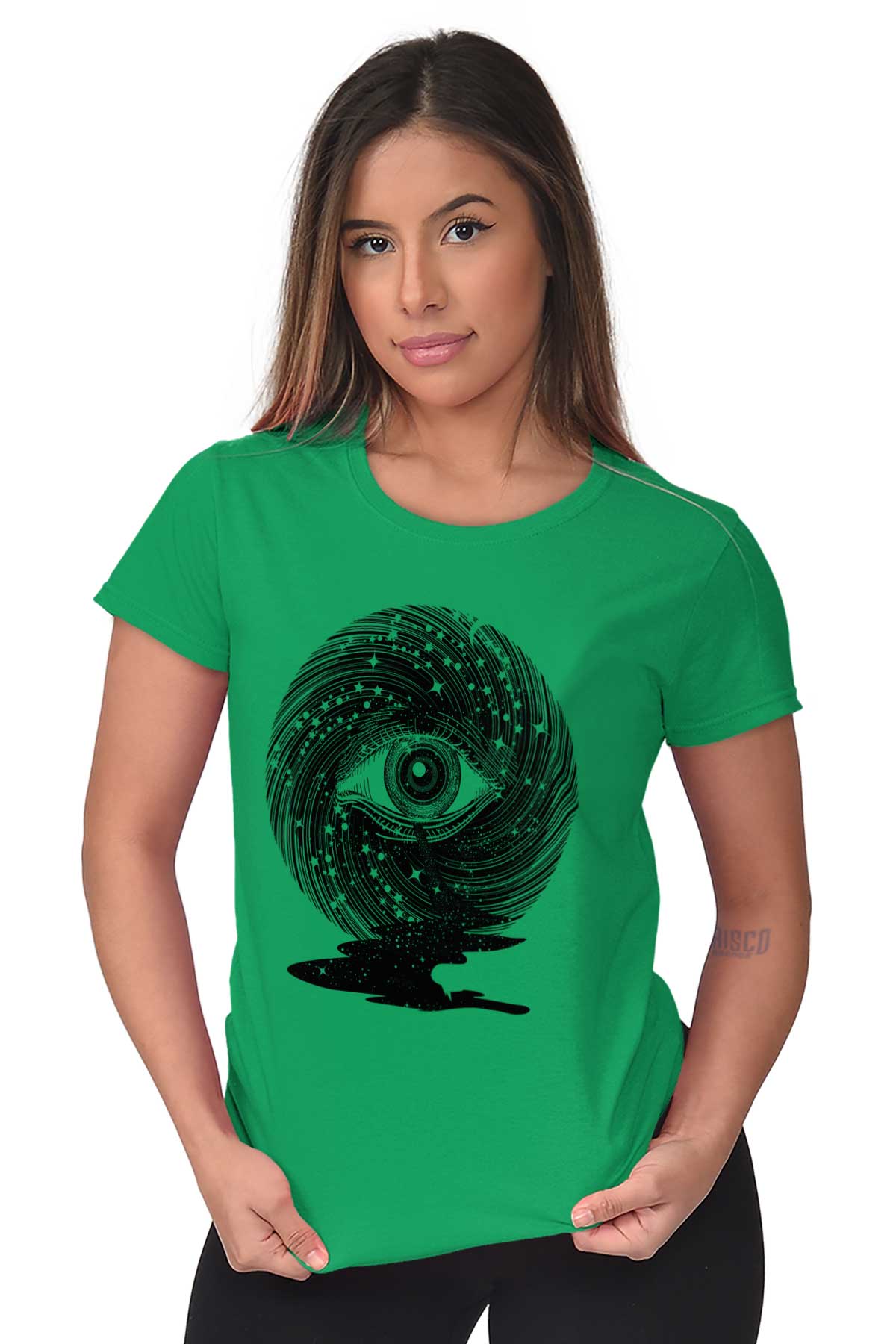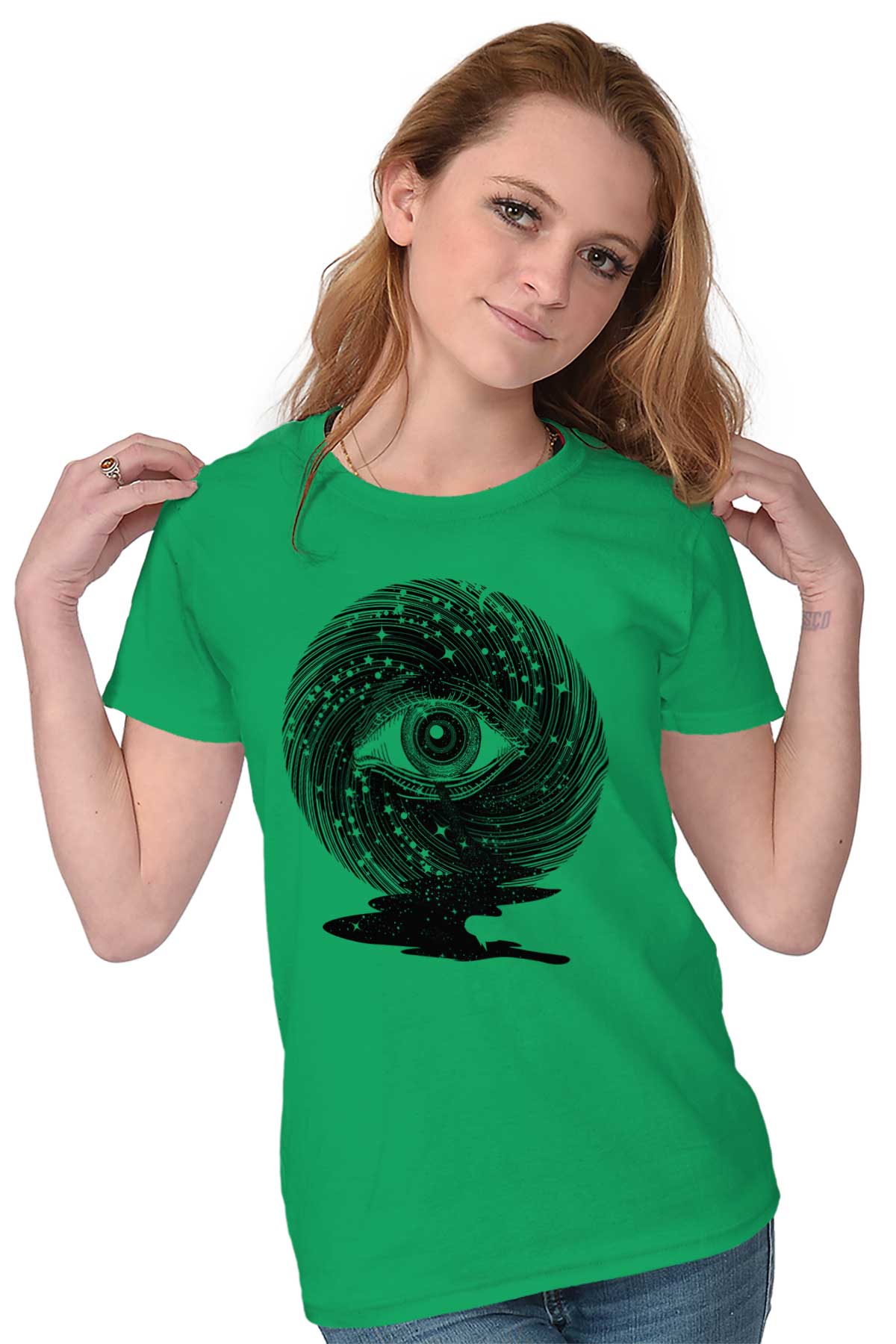 Starlight is viewed as an influential force that can guide us in the right direction. This divine navigation is not only for our physical form but for spiritual illumination. This cool Ladies T-Shirt depicts the quest for spiritual enlightenment with the iconic image of an all-seeing eye. Placed among spiraling starlight, this ocular orb is a conduit for our physical form to gain higher knowledge that will benefit our soul’s journey. The blackness of space becomes a river in front of the eye. With the star’s light, our soul’s voyage will never be in the dark.