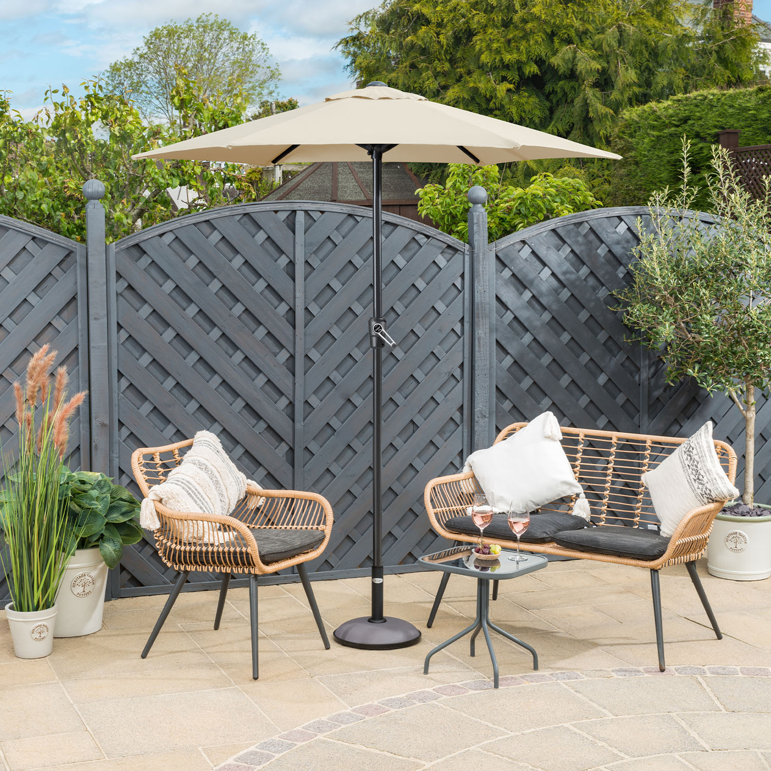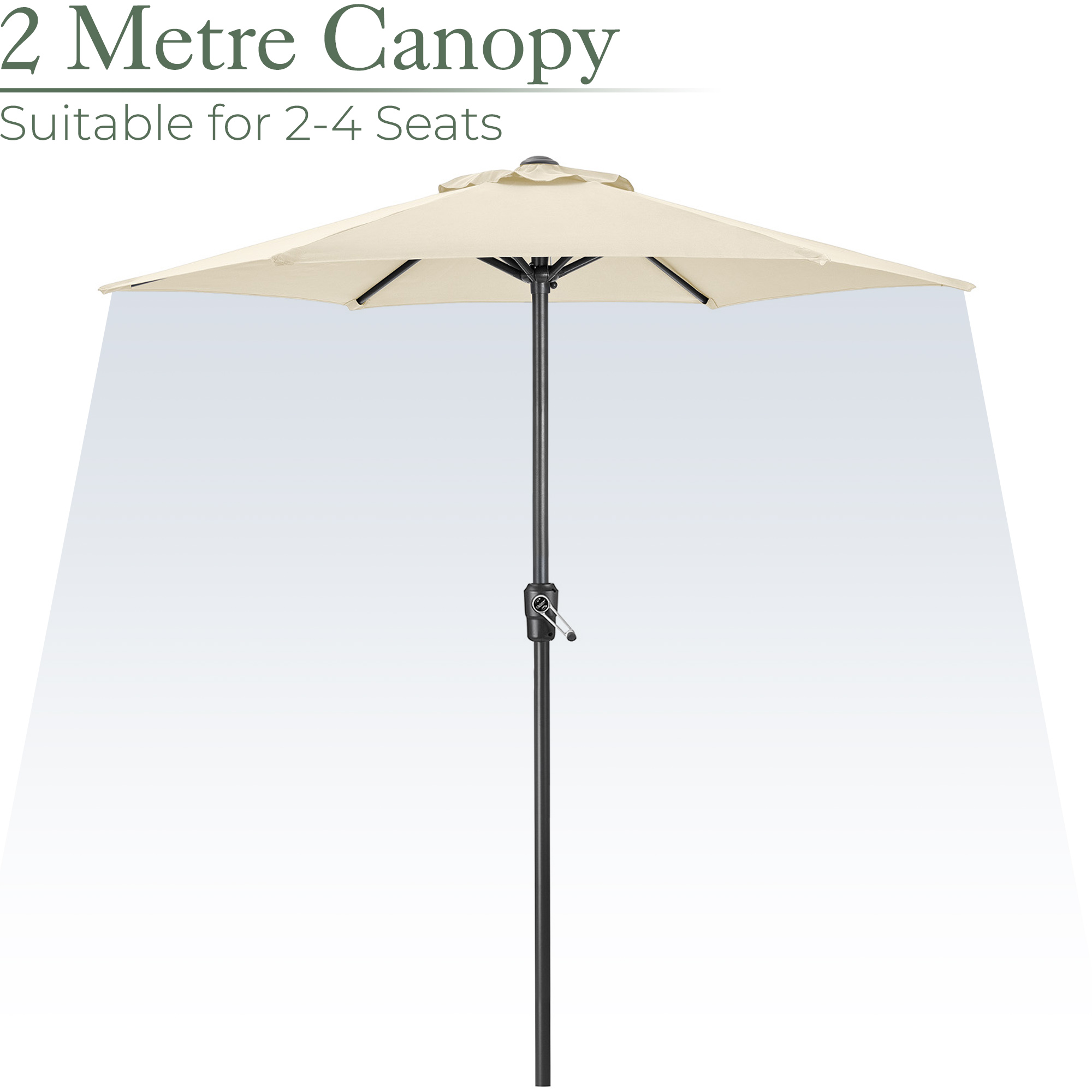 - Designed with a 2-metre canopy to suit smaller garden spaces and a crank handle to easily open and close