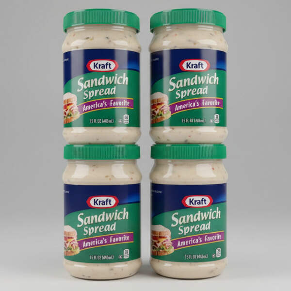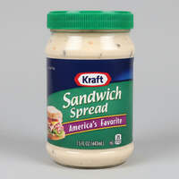 Kraft Sandwich Spread adds a creamy flavor to your favorite foods. Made with chopped pickles, vinegar, dried red bell peppers, dried onions and dried garlic, this sandwich spread has a zesty taste that complements a variety of foods. The thick texture allows for spreading, and each serving has 40 calories and 3 grams total fat per serving. Add a bit of this easy spread to tuna, cold salads or a roast beef sandwich to take your food to the next level. This Kraft spread arrives in a 15 fluid ounce jar with an inner quality seal to preserve the contents. Refrigerate this resealable jar after opening.