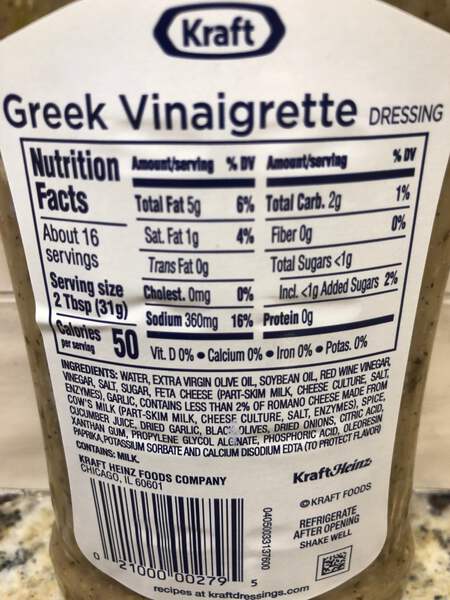 Ingredients: Water, Extra Virgin Olive Oil, Soybean Oil, Red Wine Vinegar, Vinegar, Salt, Sugar, Feta Cheese (Part-Skim Milk, Cheese Culture, Salt, Enzymes), Garlic, Contains Less Than 2 % Of Romano Cheese Made From Cow'S Milk (Part-Skim Milk, Cheese Culture, Salt, Enzymes), Spice, Cucumber Juice, Dried Garlic, Black Olives, Dried Onions, Citric Acid, Xanthan Gum, Propylene Glycol Alginate, Phosphoric Acid, Oleoresin Paprika, Potassium Sorbate And Calcium Disodium Edta (To Protect Flavor)