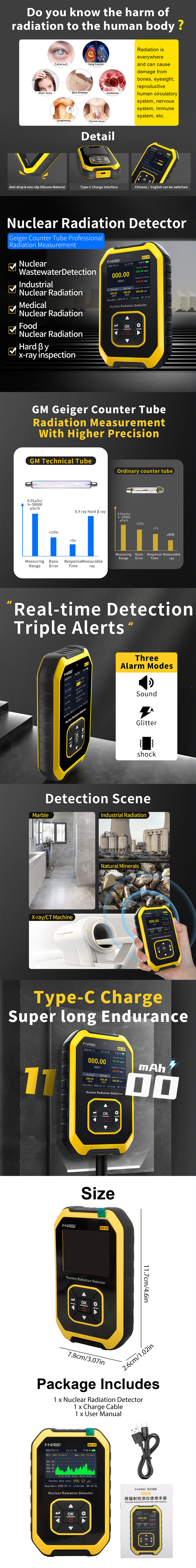 - ✨ Wide Applications:This detector has a wide range of applications, making it suitable for family decoration, radiation-shielding manufacturing enterprises, hygiene, radiation treatments, nuclear labs, nuclear stations, import-and-export commerce inspections, building materials, petroleum chemicals, geology investigations, used steels, industrial flaw detection, and more.