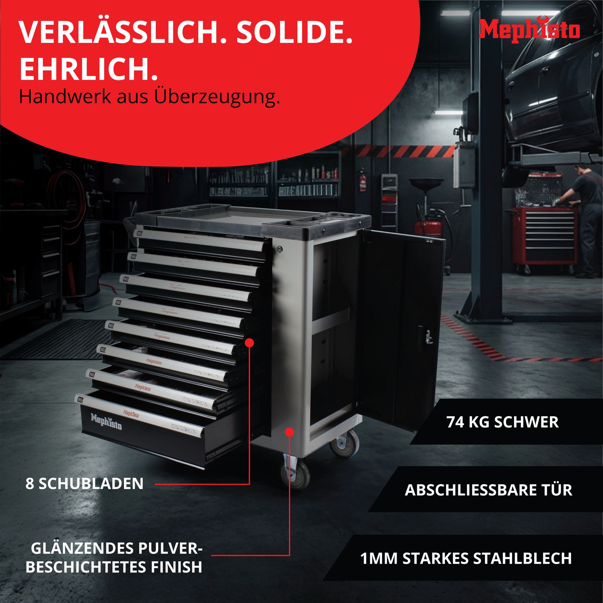 Mit seinem durchdachten Design, hochwertigen Materialien und vielseitigen Einsatzmöglichkeiten ist der Premium XXL-Werkzeugwagen von Mephisto-Tools die perfekte Wahl für professionelle Handwerker und ambitionierte Heimwerker. Investieren Sie in Qualität, die sich langfristig auszahlt!