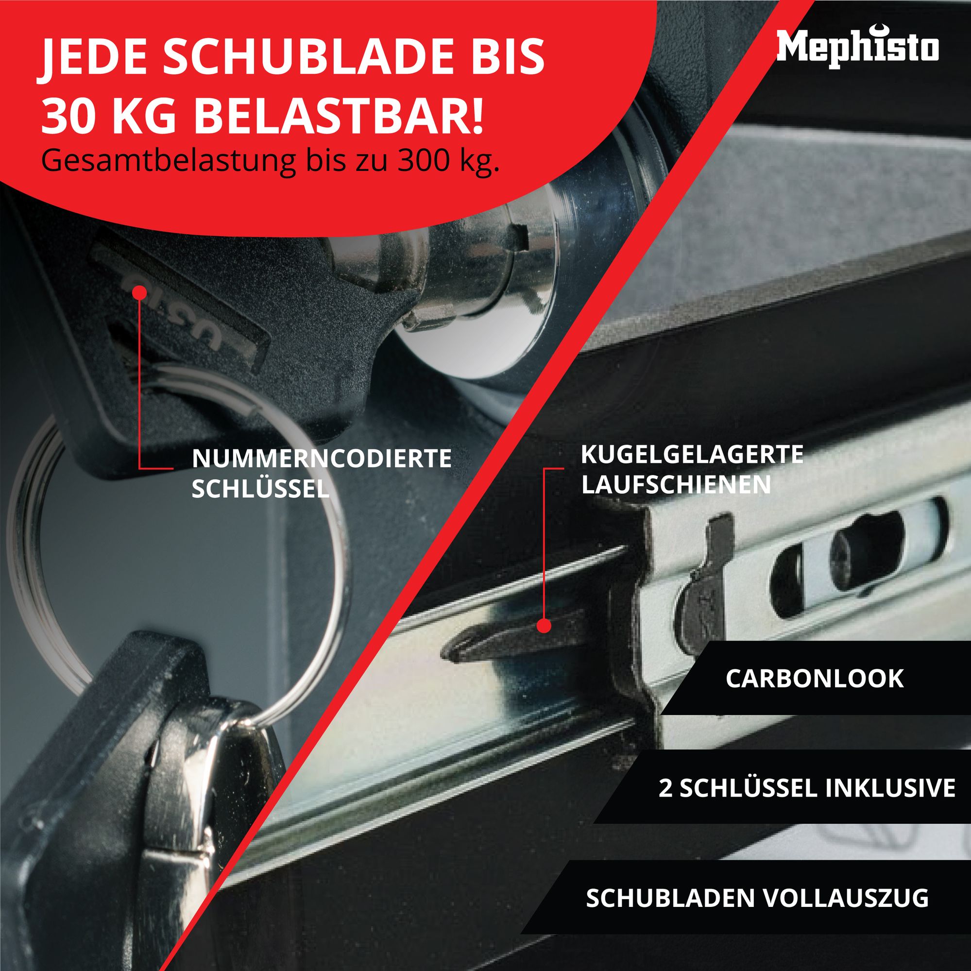 - Alle Schubladen und Fächer sind abschließbar, inkl. 2 Schlüssel.