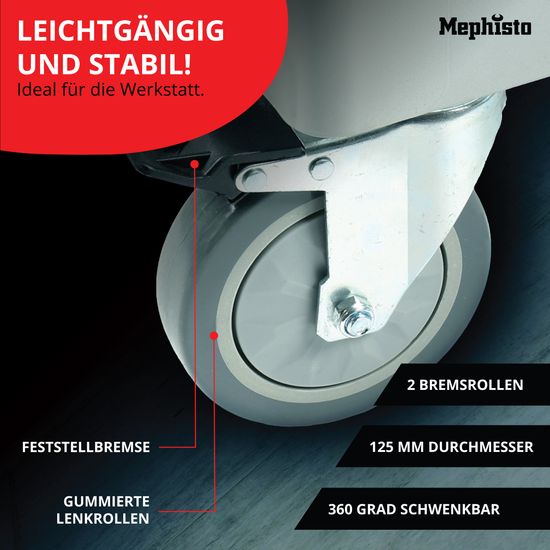 | Rollen | Ø 125 mm, 2 x Feststellbremse + 360° schwenkbar |