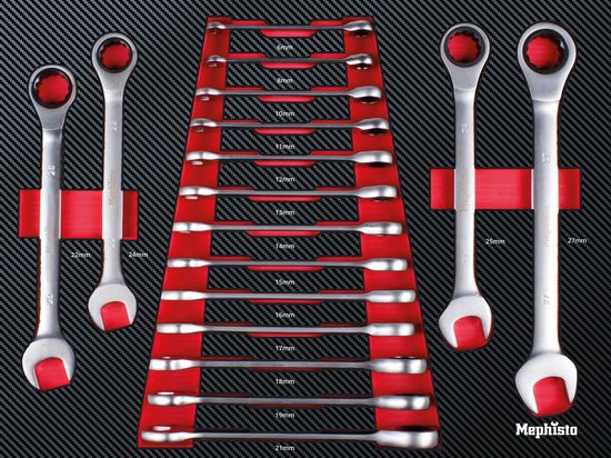 - 17 x Feinverzahnte Ratschenringmaulschlüssel 6 / 8 / 10 / 11 / 12 / 13 / 14 / 15 / 16 / 17 / 18 / 19 / 21 / 22 / 24 / 25 / 27 mm