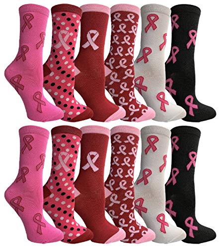 Comes in either crew length or ankle / low-cut length for various activities including soccer, softball, tennis, running, or everyday wear. Each pack includes 12 pairs of assorted colorful socks for women. Many assorted colors with pink ribbon print. Get colors including red, black, white, pink, and more! One size fits most women. Socks size 9-11 will fit womens shoe sizes 4-10.