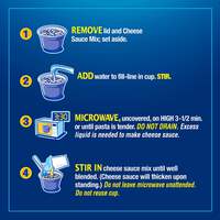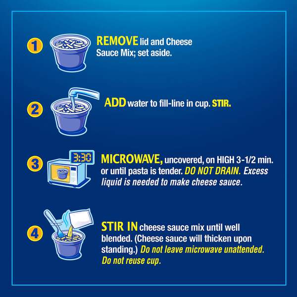 Did you know that a Kraft Mac and Cheese cup is ready in just three-and-a-half minutes? Step one: Remove lid and discard. Remove cheese sauce mix and set aside. Step two: Add water into the cup up to the fill line. Stir. Step three: Microwave, uncovered, on high for three-and-a-half minutes or until pasta is tender. Do not drain. Step four: Stir in cheese sauce mix until well blended and enjoy.