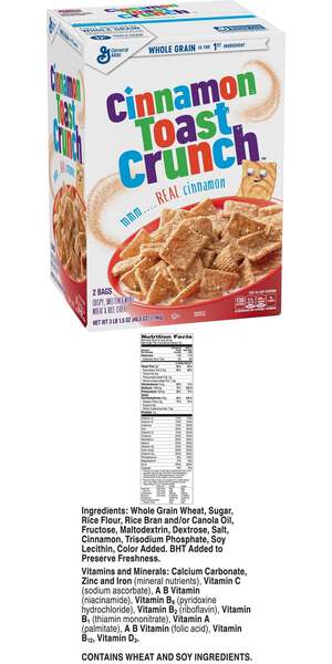 General Mills believes in the goodness of the whole grain cereal, which is why whole grain is always the first ingredient in all of their Big G cereals. The entire Big G cereal line is made with whole grains, making breakfast even healthier. Cinnamon Toast Crunch Cereal is made with whole grain wheat and rice and dusted with real cinnamon for a tasty, wholesome treat. There are 12 grams of whole grains per serving, only 130 calories, and Cinnamon Toast Crunch contains no artificial colors or flavors.