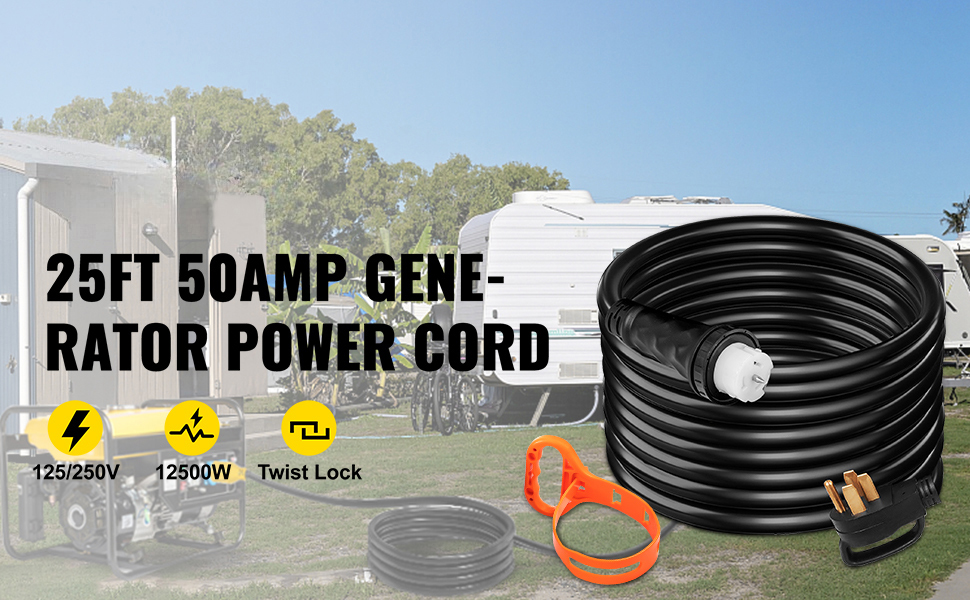 The generator cord 50 amp is secure for use with plug adaptors and extenders. You can use our cord to connect to a generator. And it is perfect for camping, tailgating, outdoor and sporting when meet hurricane season, and other bad weathers.