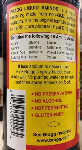 Season your favorite meats, vegetables, and rice dishes with Bragg Liquid Aminos. Our unfermented, gluten-free soy-based alternative is perfect for dishes calling for traditional Soy of Tamari sauce. This savory sauce will satisfy your cravings and stimulate a full feeling. Our recipe features 16 naturally occurring amino acids, and unlike most of the commercially prepared soy sauces, it contains no sodium benzoate or other chemical preservatives. We combine the savory, hunger-curbing satisfaction of 'umami' flavor with the proven wellness advantages of premium liquid aminos. Bragg Liquid Aminos Seasoning Sauce, Soy Sauce Alternative, 16 Fluid Ounces Flavorful soy sauce replacement for gluten-free, vegan and paleo diets No artificial preservatives, Not Fermented, No Alcohol, and Gluten Free Savory 'umami' flavor profile that stimulates feelings of fullness Contains no sodium benzoate or other chemical preservatives Use in dishes that call for Soy Sauce or Tamari Sauce Gluten-Free, Non-GMO Project Verified and KSA Certified Kosher Also available in Bragg Organic Apple Cider Vinegar with Mother, Salad Dressings, and Apple Cider Vinegar Cleanse Visit Bragg for recipes and ways to use Bragg products Contains 16 Liquid Amino Acids: Alanine | Arginine | Aspartic Acid | Glutamic Acid | Glycine | Histdine | Isoleucine | Lysine | Leucine | Methionine | Phenylalanine | Proline | Serine | Threonine | Tyrosine | Valine Our Vital Difference A diet rich in organic fruits and veggies is essential to vibrant health. We've known, practiced and promoted that common-sense fact for over a hundred years. Now science is finally catching up with our time-tested wisdom. We're here to help you live more vibrantly, every day for the rest of your life. How? By making sure that every product we offer faithfully delivers the same, proven dose of wellness we've consistently provided our customers since 1912. We're here to support, provide, and be your guide. 16-ounce bottle of organic liquid aminos for seasoning Soy protein seasoning alternative to soy sauce to flavor your favorite dishes Umami flavor stimulates feelings of fullness Use with your favorite meat, vegetable, and rice dishes Does not contain chemicals, such as sodium benzoate Gluten-free, Non-GMO Verified, and Certified Kosher Bragg All-Natural Liquid Aminos All Purpose Seasoning, 16 fl oz: All-purpose seasoning from soy protein Natural soy sauce alternative Contains no preservatives Certified non-GMO Gluten-free soy seasoning All-natural Kosher Bragg Liquid Aminos is a vegetable protein seasoning from healthy soybeans From the original formulas by health pioneer and originator of health stores, Paul C. Bragg A gourmet alternative to tamari sauce No alcohol Not fermented Nutrition you need, taste you love Use to season your favorite foods and also makes a delicious broth Directions: if less sodium is desired, use a 6 oz. spray bottle, then dilute with 1/3 purified water or to taste and then either add in or spray Bragg's on food Shake if sediment occurs Ideal for salads, veggies, rice and beans, tofu, tempeh, potatoes, meat, poultry, fish and popcorn and in dressings, gravies and sauces, casseroles, stir-fries and macrobiotics 16 fl oz bottle of all-natural seasoning Ingredients: Ingredients: Vegetable Protein from Non-GMO Soybeans and Purified Water. Directions: Instructions: Shake if sediment occurs. If less sodium is desired use 6 oz Bragg???s spray bottle, then dilute with 1/3 purified water or to taste and then either add in or spray Bragg???s on food.