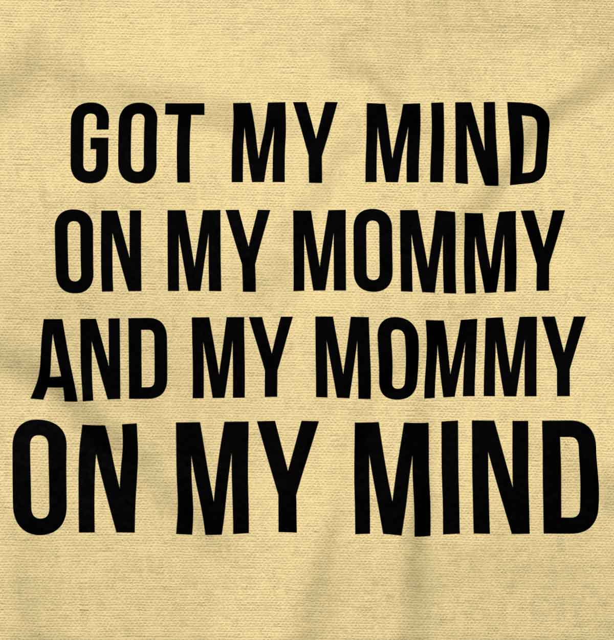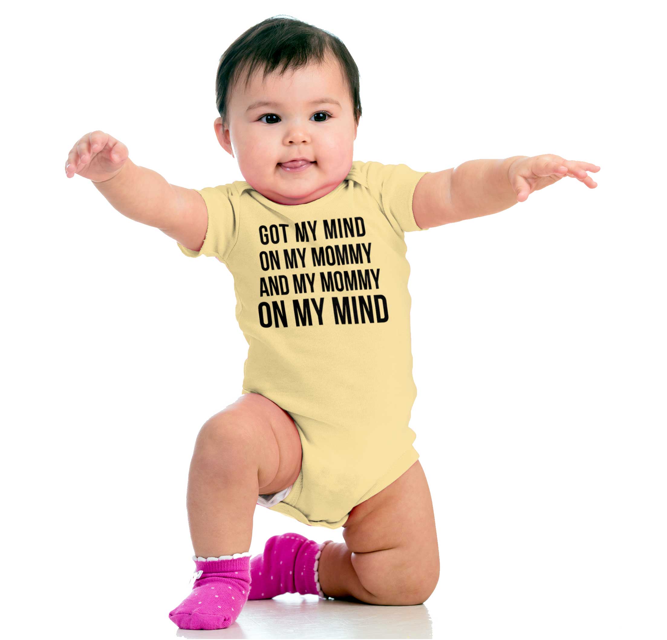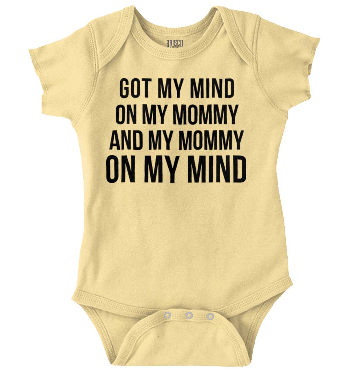 This funny mom Romper Bodysuit says it all. Got my mind on my mommy and my mommy on my mind. If you love mommy then this awesome Romper Bodysuit is for you. Keep mommy's heart with this awesome mommy outfit and let everyone know that no matter how much anyone else loves you, this mommy is yours. Let them know that you got your mommy on your mind and you can't stop thinking about her! This will get awws at the next family event and make heads swoon with its cuteness. Not only that but mommy will feel loved by your hilarious piece - making daddy a little jealous.